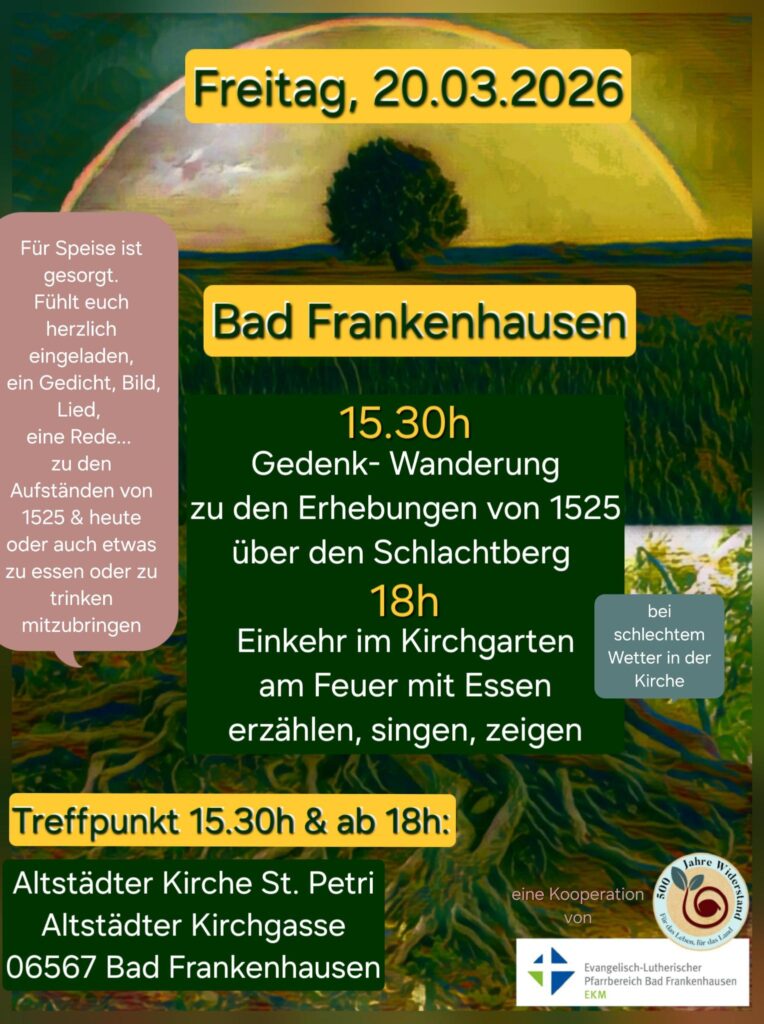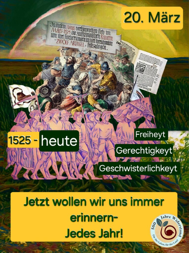 Für Speise ist gesorgt. Fühlt euch herzlich eingeladen, ein Gedicht, Bild, Lied, eine Rede … zu den Aufständen von 1525 & heute oder auch etwas zu essen oder zu trinken mitzubringen.