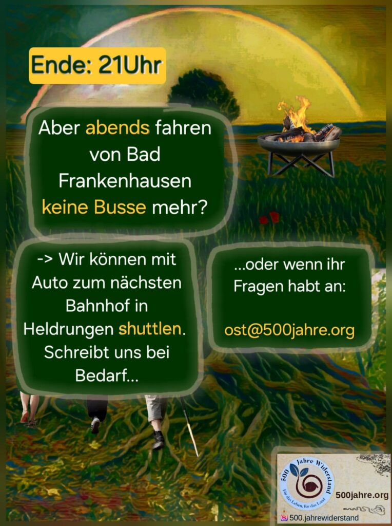 Aber abends fahren von Bad Frankenhausen keine Busse mehr? Wir können mit Auto zum nächsten Bahnhof in Heldrungen shuttlen. Schreibt uns bei Bedarf oder wenn ihr Fragen habt an: ost[ät]500jahre.org